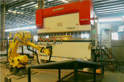 廠區(qū)內(nèi)的鈑金車間是志高機械空壓機、鉆機產(chǎn)品外罩殼的主要生產(chǎn)車間,為滿足市場需求,車間內(nèi)每天的外罩殼產(chǎn)量需保持在一百套以上,生產(chǎn)壓力比較大。傳統(tǒng)的鈑金車間每臺折彎機需配備一到兩名的操作手,工人需要搬運繁重的鋼板材料,工作效率和安全性都不高。隨著科技的發(fā)展,新技術(shù)、新工藝的變革也給鈑金加工業(yè)帶來了巨大的變化,志高公司順應(yīng)時代發(fā)展潮流,花重金購買了一臺全自動折彎機器人設(shè)備。 該套設(shè)備中的機器人是日本原裝進口,配臺美國愛客公司折彎機設(shè)備及軟件,主要運用于鈑金外罩的自動化折彎。其特點是利用編程及設(shè)備先進的感應(yīng)系統(tǒng),加上六軸機器人的舉升配合折彎機的工作,確保了折彎的精度,同時大大提高了折彎效率,尤其是針對面積大 、重量重的板材作用明顯。