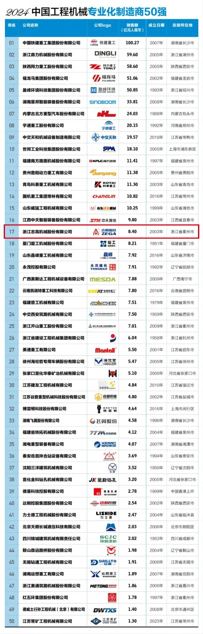 •       2024年10月15日,“2024中國工程機械專業(yè)化制造商50強”發(fā)榜,志高機械憑借出色實力入選,位列第17位。2022年,志高機械被工信部評為國家“專精特新”小巨人企業(yè),此次入選是對志高在工程機械領(lǐng)域?qū)I(yè)化程度的再次認可。