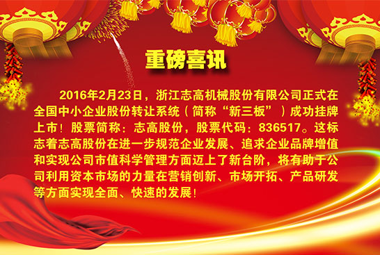 重磅喜訊:浙江志高機械股份有限公司成功掛牌“新三板”